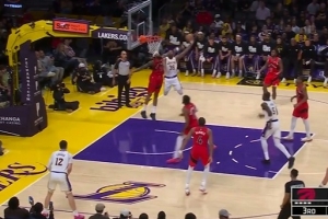 黄雀在后!詹姆斯奋力追防 高高跃起送阿巴基钉板大帽